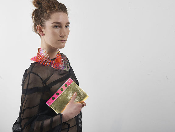Limited edition hand dyed laser cut acrylic with rope detail and gold clasps.